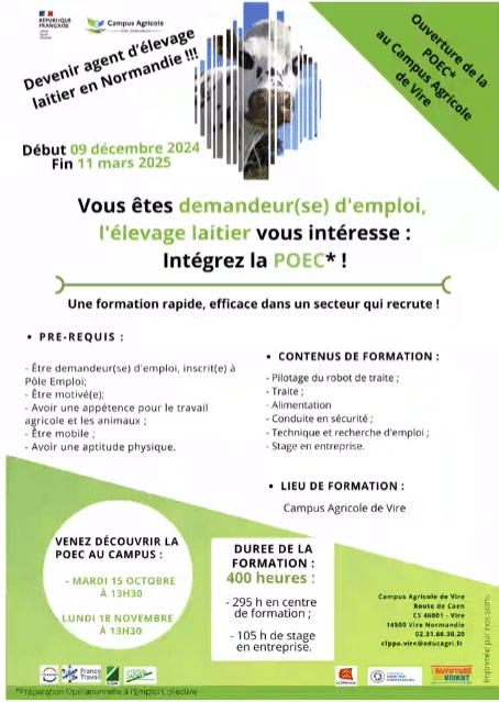 UNe PREPARATION OPERATIONNELLE à l’EMPLOI (POEC) « agent d’elevage laitier » démarre en decembre 2024